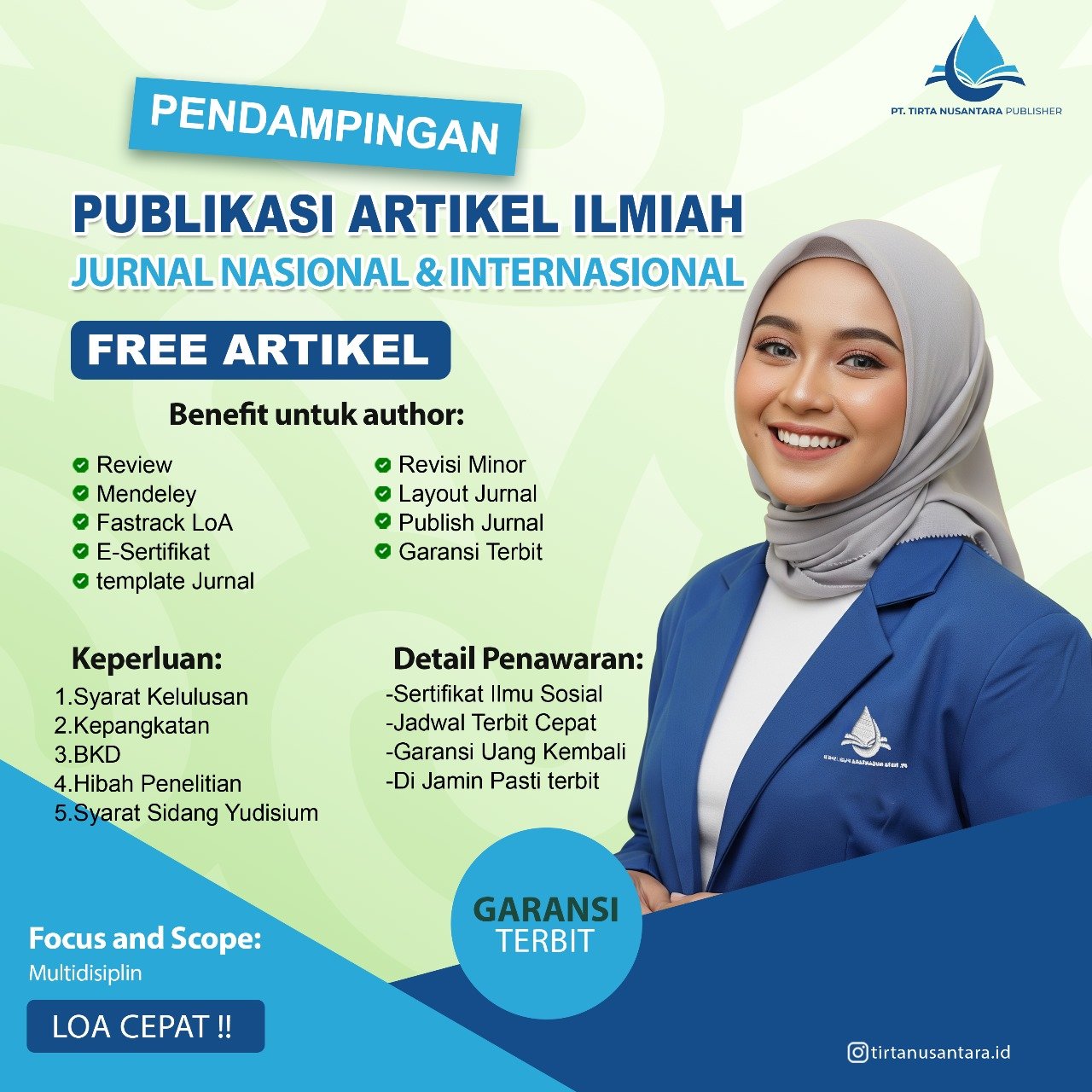 PT Tirta Publisher (PT Tirta Nusantara Publisher) melayani publikasi artikel, tugas akhir, dan penelitian untuk publikasi Nasional ISSN, Nasional SINTA, Internasional Scopus, dan Internasional Non Scopus.